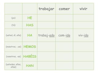 El documento explica el pretérito perfecto, un tiempo verbal que expresa acciones realizadas en el pasado cuyos efectos perduran en el presente. Se forma con el verbo auxiliar "haber" en presente de indicativo y el participio del verbo conjugado. Además, proporciona ejemplos de participios irregulares y marcadores temporales que se usan con el pretérito perfecto como "esta noche", "este año", y "nunca".