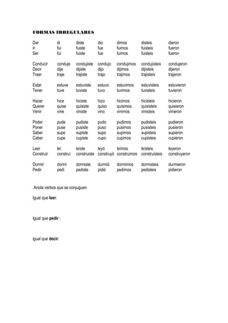 El documento describe las formas del pretérito perfecto simple en español. Explica las terminaciones regulares e irregulares de los verbos en esta forma verbal en singular y plural para la primera, segunda y tercera persona. También incluye una lista de verbos irregulares y sus conjugaciones correspondientes en el pretérito perfecto simple.
