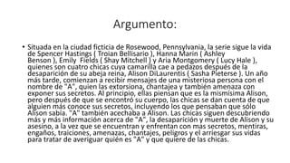 La serie Pretty Little Liars sigue la vida de cuatro chicas - Spencer, Hanna, Emily y Aria - cuyo grupo se desmorona después de la desaparición de su líder Alison. Un año más tarde, comienzan a recibir mensajes amenazantes de alguien llamado "A" que conoce sus secretos. A lo largo de las temporadas, las chicas intentan descubrir la identidad de "A" y lo que realmente le sucedió a Alison, enfrentando más secretos, mentiras y peligros en el proceso.