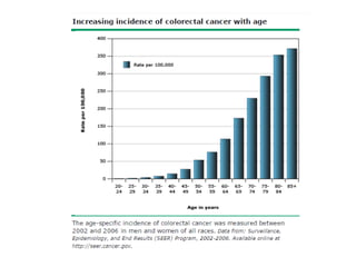Este documento describe los métodos de cribado de cáncer colorrectal (CCR), incluyendo pruebas de sangre oculta en heces, sigmoidoscopia y colonoscopia. Explica que el cribado reduce la mortalidad por CCR en un 53% mediante el diagnóstico y tratamiento tempranos. Recomienda el cribado para la población de riesgo medio entre 50-74 años usando pruebas anuales o bienales de sangre oculta en heces o endoscopias cada 5-10 años.