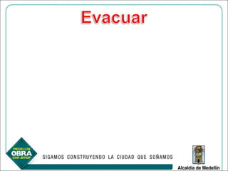 El documento proporciona instrucciones sobre qué hacer durante una emergencia, incluyendo conservar la calma, evacuar de manera ordenada, verificar la situación antes de actuar, buscar salidas de emergencia seguras sin usar ascensores o escaleras, y llamar a los servicios de emergencia una vez fuera de peligro.