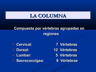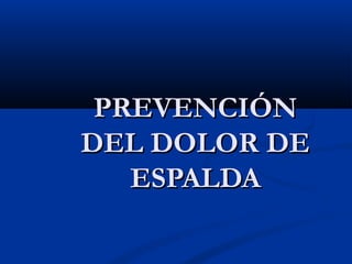 Este documento resume las partes y funciones de la columna vertebral, incluyendo las vértebras, discos intervertebrales, médula espinal y nervios. Explica los movimientos permitidos por los discos y las causas comunes del dolor de espalda, como cambios en las curvaturas, daños en los discos o posturas inadecuadas. Finalmente, ofrece recomendaciones para prevenir el dolor de espalda a través del ejercicio, buena postura y levantar objetos correctamente.