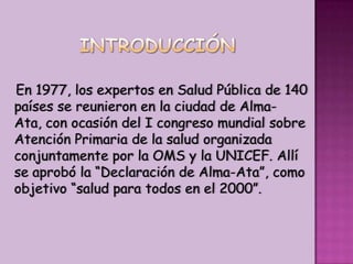El documento aborda la prevención primaria de la salud, destacando la Declaración de Alma-Ata de 1977 que establece el objetivo de 'salud para todos'. Se enfoca en acciones que preservan la salud de individuos y comunidades, e incluye medidas de promoción y protección específicas. Además, ofrece 12 consejos prácticos para cuidar la salud y menciona la importancia de la educación y participación comunitaria en la atención sanitaria.