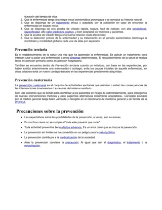 Este documento describe los cuatro tipos principales de prevención en salud pública: prevención primaria, que incluye promoción de la salud y protección antes de que aparezca una enfermedad; prevención secundaria o detección temprana mediante exámenes de detección; prevención terciaria, que implica el tratamiento para curar o aliviar una enfermedad existente; y prevención cuaternaria, que busca evitar consecuencias innecesarias de intervenciones médicas. También advierte sobre posibles