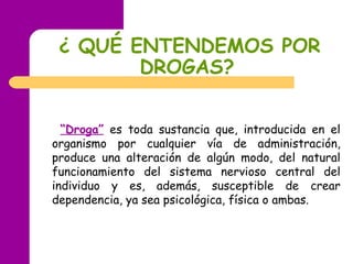 Este documento proporciona información sobre diferentes tipos de drogas, incluyendo sus efectos, consecuencias del consumo y qué hacer en caso de emergencia. Define qué son las drogas y explica los diferentes tipos de consumo. Además, clasifica las drogas y describe específicamente el cannabis, la cocaína, las drogas de síntesis como el éxtasis, las anfetaminas, los alucinógenos, la heroína y el alcohol, detallando sus efectos psicológicos, fisiológicos y principales consecuencias. Por último