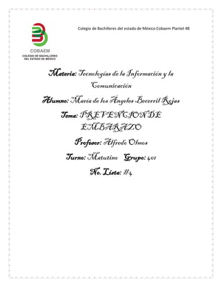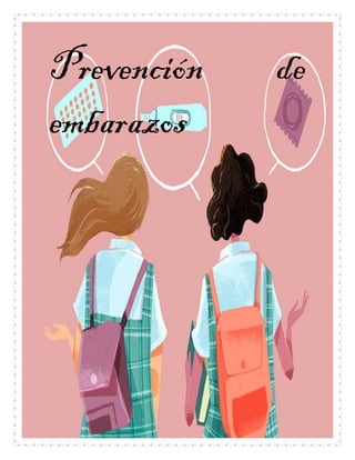 Este documento trata sobre la prevención del embarazo en adolescentes. Discute los riesgos físicos y psicológicos del embarazo precoz, incluyendo mayores tasas de mortalidad y enfermedades. También cubre las causas del embarazo adolescente como la presión social, el uso de drogas y alcohol, y el uso incorrecto o falta de anticonceptivos. Finalmente, presenta diferentes métodos anticonceptivos y sus características.