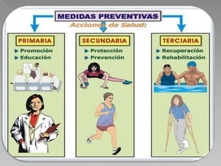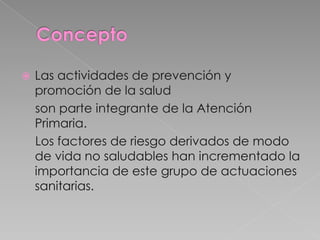 El documento habla sobre las actividades de prevención y promoción de la salud como parte integral de la atención primaria. Explica los tres niveles de prevención - primaria, secundaria y terciaria - y sus objetivos de disminuir la incidencia de enfermedades, reducir la morbimortalidad y evitar complicaciones, respectivamente. Además, destaca que la prevención de salud se basa en acudir y atender enfermedades de riesgo para prevenir que afecten al cuerpo humano y mejorar la calidad de vida