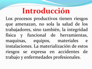 Este documento introduce los conceptos básicos de la prevención de riesgos laborales, incluyendo la definición, objetivos, disciplinas (seguridad industrial y higiene industrial), riesgos más frecuentes, y la gestión del sistema de prevención de riesgos a través de la evaluación de riesgos, planificación, organización y control. Explica que la prevención de riesgos laborales consiste en adoptar medidas para evitar accidentes y enfermedades derivadas del trabajo mediante la aplicación de la seguridad y la higiene industrial.