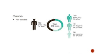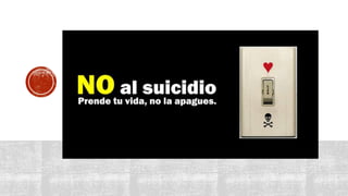 El documento presenta información sobre el suicidio, incluyendo factores de riesgo, grupos de edad vulnerables, y formas de prevenir el suicidio. Aborda temas como las causas del suicidio, las perspectivas físicas, emocionales, intelectuales y sociales de las personas suicidas, y los grupos más afectados como adolescentes, adultos y adultos mayores. También proporciona consejos sobre cómo ayudar a alguien que pueda estar considerando el suicidio y recursos de apoyo disponibles.