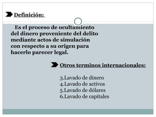 La legitimación de capitales es el proceso de ocultar el dinero proveniente de un delito haciéndolo parecer legal. Tiene tres etapas: colocación del dinero ilegal en el sistema financiero, diversificación del dinero a través de transacciones, e integración para gozar de los capitales ilícitos. Es un delito conexo y doloso que puede cometerse de forma culposa por negligencia, imprudencia, impericia o inobservancia. Las instituciones financieras y otros sujetos obligados deben implementar sistemas integrales de prevención