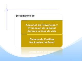 El documento describe la estrategia PREVENIMSS del IMSS para la promoción y prevención de la salud. Ofrece acciones sistemáticas organizadas por grupos de edad para mejorar la salud de los derechohabientes a través de la promoción de la salud, prevención de enfermedades, detección oportuna y educación. El objetivo es mejorar la calidad de la atención médica familiar mediante la cobertura de programas integrales de salud.