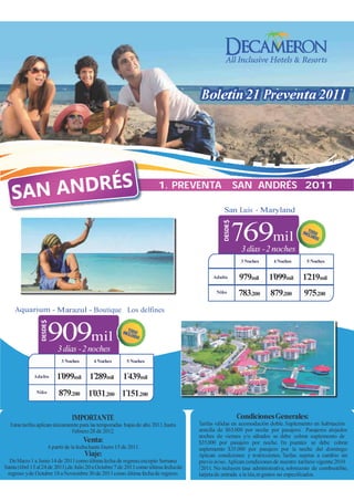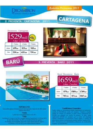 Este boletín presenta tarifas para paquetes turísticos todo incluido en varios destinos de Colombia como San Andrés, Cartagena, Barú, Santa Marta, Isla Palma y Amazonas entre marzo y noviembre de 2011. Incluye precios para adultos y niños por 3, 4 o 5 noches con detalles sobre condiciones, fechas de venta y viaje.
