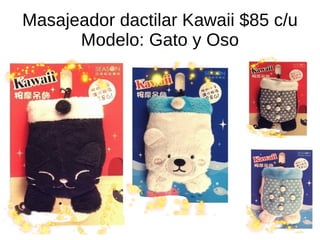 La preventa kawaiitastica ofrece una variedad de productos originales de marcas como Sanrio y San-X con precios que varían desde $85 hasta $490, incluyendo artículos como masajeadores, peluches y agendas para 2012. Para participar, los interesados deben seleccionar los artículos, enviarlos por correo y realizar un anticipo del 30%, mientras que las compras son finales sin devoluciones pero con crédito de tienda disponible. Además, al comprar en preventa, los clientes pueden acceder a precios más bajos, facilidades de pago y promociones exclusivas.