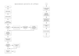 El documento describe los pasos para realizar el mantenimiento preventivo de software en una computadora personal. Estos pasos incluyen conectar y encender el equipo, notificar al cliente si no enciende, respaldar información y drivers si el cliente desea una reparación, actualizar el sistema operativo y drivers si es necesario, ejecutar un antivirus, limpiar el registro, eliminar programas y archivos basura, desfragmentar el disco duro y liberar espacio, y entregar la computadora al cliente después de completar el mantenimiento.