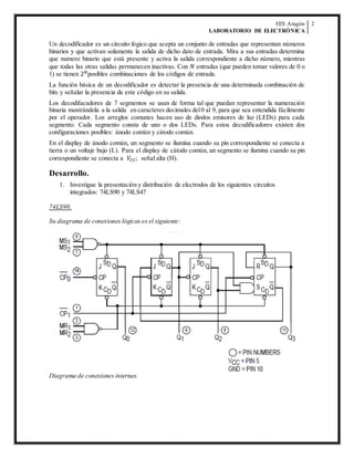 Este documento describe circuitos digitales de conteo y decodificación a 7 segmentos. Explica que un decodificador acepta entradas binarias y activa solo la salida correspondiente. Describe displays de 7 segmentos que representan números del 0 al 9. Luego analiza los circuitos integrados 74LS90, 74LS47 y TIL de ánodo común, incluyendo sus diagramas, tablas de verdad y especificaciones.