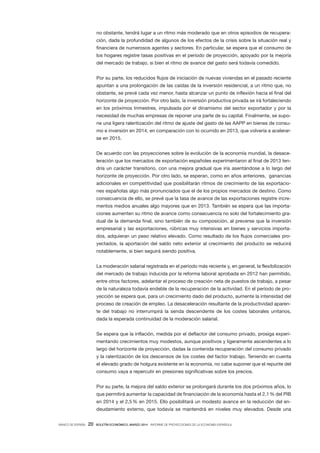 Este documento presenta las proyecciones macroeconómicas de la economía española para 2014-2015 realizadas por el Banco de España. Se espera una consolidación de la recuperación económica con un crecimiento del PIB superior al 1% anual, impulsado principalmente por la demanda interna. La inflación se mantendrá moderada debido a la holgura en la economía. Existen riesgos a la baja para el crecimiento y la inflación, aunque se vislumbran también posibilidades de una recuperación más sólida.