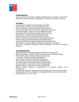 Este documento presenta un protocolo sobre normas mínimas para el desarrollo de programas de vigilancia de la pérdida auditiva por exposición a ruido en los lugares de trabajo en Chile. Incluye antecedentes sobre el marco legal y epidemiológico, definiciones, responsabilidades, y lineamientos para la vigilancia ambiental de la exposición al ruido y la salud de los trabajadores expuestos. El objetivo es establecer requisitos mínimos para la implementación de programas que permitan detectar tempranamente los problemas de audición de