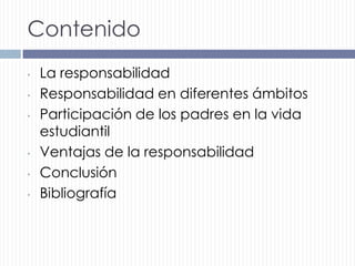 El documento habla sobre la responsabilidad estudiantil en el colegio. Explica que la responsabilidad es un valor que permite reflexionar sobre las consecuencias de los actos. También describe cómo la responsabilidad se manifiesta en diferentes ámbitos como el estudiantil y social. Además, señala algunas ventajas de ser responsable como forjar el carácter y volverse organizado.