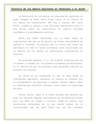 Este documento resume la historia de los medios digitales en Venezuela y en el mundo. Explica cómo Internet ha ejercido presión sobre los periódicos tradicionales y cómo países como China han logrado censurar contenido en la web. También describe el desarrollo de la televisión digital en Venezuela desde el 2000 y cómo el gobierno venezolano usa redes sociales como Twitter para comunicarse. Finalmente, analiza cómo las grandes corporaciones y nuevas tecnologías están rompiendo la relación entre territorio y cultura.