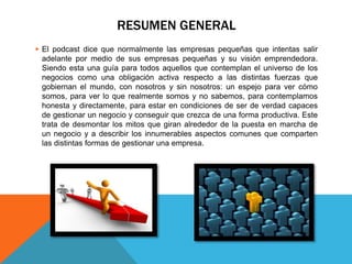 El documento resume los principales puntos sobre el desarrollo de pequeñas empresas. Destaca que 1) las pequeñas empresas suelen fracasar debido a factores más allá del carácter del emprendedor, 2) es necesario un cambio de mentalidad para sobrevivir, y 3) el propietario debe ser capaz de cambiar y renovar la empresa sistemáticamente para que prospere. También menciona el caso de la empresa Gerber como ejemplo de cómo entender al cliente y ofrecer un producto único puede llevar al éxito.