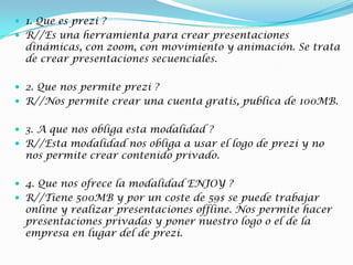 Prezi es una herramienta para crear presentaciones dinámicas con animación y zoom. Ofrece cuentas gratuitas de 100MB que requieren incluir el logo de Prezi y no permiten contenido privado. Las modalidades de pago Enjoy y Pro ofrecen mayor capacidad de almacenamiento y funciones avanzadas como personalizar logos y crear presentaciones offline. Para crear una cuenta se requiere proporcionar un correo electrónico y contraseña. Una vez creada la cuenta se puede acceder a las presentaciones guardadas y crear nuevas en un lienzo blanco