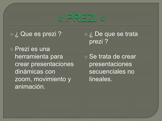 Prezi es una herramienta para crear presentaciones dinámicas con zoom, movimiento y animación que permite definir el orden no lineal de los elementos colocados en un gran lienzo, trabajando desde cualquier navegador en la nube sin necesidad de instalar nada. Con Prezi podemos agregar objetos, texto e imágenes y movernos por la presentación de forma no secuencial.