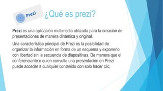 Prezi es una aplicación multimedia que permite crear presentaciones de manera dinámica y no lineal. A diferencia de PowerPoint que tiene una estructura secuencial de diapositivas, Prezi organiza la información en un esquema interactivo donde se puede acceder a cualquier contenido con un clic. Prezi se utiliza como herramienta para presentar ideas de forma libre u estructurada mediante objetos como texto, imágenes y videos colocados en un lienzo.