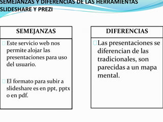 Este documento compara las herramientas Slideshare y Prezi, destacando sus semejanzas y diferencias. Ambas permiten crear presentaciones en línea de forma similar a un mapa mental, aunque Slideshare requiere presentaciones en formato PPT mientras que Prezi permite crearlas directamente en la nube. Slideshare es gratuito mientras que Prezi ofrece solo el primer mes gratis.