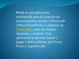 Prezi es una aplicación multimedia para crear presentaciones de forma dinámica y original, similar a PowerPoint pero con objetos que se pueden mover y ampliar/reducir sobre un lienzo. Permite importar archivos de PowerPoint y organizar el texto, imágenes y videos de manera lineal o no lineal. La presentación final se puede ver en un navegador o de forma offline y utiliza un modelo freemium donde los usuarios gratuitos tienen menos funciones que los de pago.