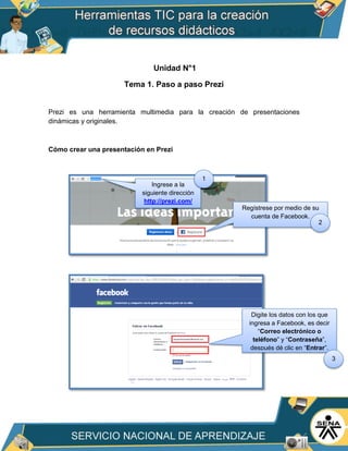 Este documento proporciona instrucciones paso a paso para crear y editar presentaciones en Prezi. Explica cómo registrarse en Prezi, crear una nueva presentación, agregar títulos, texto e imágenes, cambiar el tema y ejecutar la presentación. También cubre cómo insertar videos de YouTube y modificar el tamaño y posición de los elementos en la presentación. El objetivo es enseñar a los usuarios a aprovechar todas las funciones de Prezi para crear presentaciones dinámicas y atractivas.