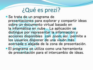 Prezi es un programa de presentaciones basado en la nube que permite a los usuarios crear presentaciones no lineales mediante el uso de zoom. Fue creado en 2007 por Ádám Somlai-Fischer y desarrollado con el profesor Péter Halácsy y el empresario Peter Arvai. Prezi permite a los usuarios insertar medios como imágenes, texto y videos y diseñar la relación entre los objetos mediante el desplazamiento y el tamaño. Más de 50 millones de personas utilizan actualmente esta herramienta de presentación