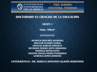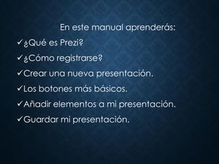 El documento proporciona una guía para el uso de la herramienta Prezi. Explica cómo crear una cuenta en Prezi de forma gratuita, añadir elementos como texto e imágenes a una presentación, y guardar el trabajo. Además, describe las ventajas de Prezi sobre PowerPoint, como la capacidad de desplazarse por una sola diapositiva en lugar de pasar de una a otra de forma lineal.