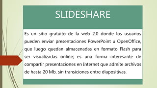 Este documento compara dos herramientas web para crear y compartir presentaciones: SlideShare y Prezi. SlideShare permite subir presentaciones PowerPoint u OpenOffice para verlas en línea, mientras que Prezi usa un solo lienzo en lugar de diapositivas separadas. Ambas almacenan las presentaciones en formato Flash, pero Prezi permite mayor capacidad de almacenamiento y puede usarse con o sin conexión a Internet.