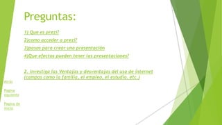 Este documento contiene información sobre Prezi, una aplicación multimedia para crear presentaciones de manera dinámica y original. Explica que Prezi permite organizar la información en un esquema en 3D en lugar de diapositivas, y navegar libremente por el contenido. Además, incluye los pasos básicos para crear una presentación en Prezi y algunos efectos visuales que se pueden incluir. Por último, analiza brevemente las ventajas y desventajas del uso de Internet en diferentes ámbitos como la familia, el empleo