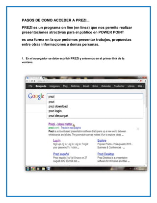 Este documento proporciona instrucciones sobre cómo acceder y usar Prezi, un programa en línea para crear presentaciones. Explica los 7 pasos para registrarse en Prezi, crear una nueva presentación, seleccionar una plantilla, y comenzar a agregar diapositivas dinámicas y atractivas.