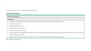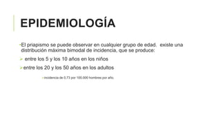 El priapismo puede afectar a hombres de cualquier edad, pero es más común entre los 5-10 años y los 20-50 años. Existen dos tipos principales: isquémico (de bajo flujo), que es más común y representa una emergencia médica si dura más de 4 horas; y no isquémico (de alto flujo), que generalmente no requiere tratamiento urgente y puede resolverse espontáneamente. El diagnóstico y tratamiento adecuados dependen de determinar el tipo de priapismo mediante análisis de gases en sangre ca