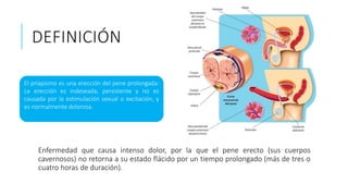 El priapismo es una erección prolongada e indeseada del pene que no se asocia con la estimulación sexual. Se clasifica en priapismo isquémico (de bajo flujo), causado por obstrucción venosa, o priapismo arterial (de alto flujo), causado por trauma. El priapismo isquémico requiere tratamiento urgente para evitar daño permanente al tejido eréctil, mientras que el arterial generalmente se trata de forma conservadora. Las causas incluyen medicamentos, enfermedades hematológicas y neoplasias.