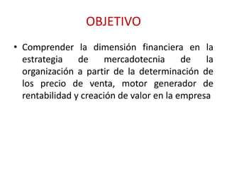 1) El documento trata sobre la fijación estratégica de precios y finanzas en el contexto de un diplomado de mercadotecnia aplicada. 2) Explica conceptos clave como la determinación de precios de venta, margen de contribución, punto de equilibrio, y rentabilidad. 3) El objetivo es comprender la dimensión financiera en la estrategia de mercadotecnia y cómo los precios son un motor de rentabilidad y creación de valor para la empresa.