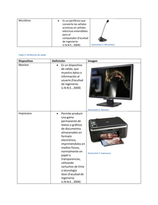 El documento describe diferentes periféricos de entrada y salida para computadoras. Entre los periféricos de entrada se encuentran el teclado, mouse, scanner y micrófono. El teclado permite la introducción de datos, el mouse se desliza sobre una superficie para acceder a áreas y ejecutar acciones, el scanner convierte imágenes a puntos de datos y el micrófono convierte el sonido a señales eléctricas. Los periféricos de salida incluyen el monitor para mostrar información, la impresora para imprimir documentos, los parlantes