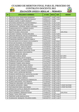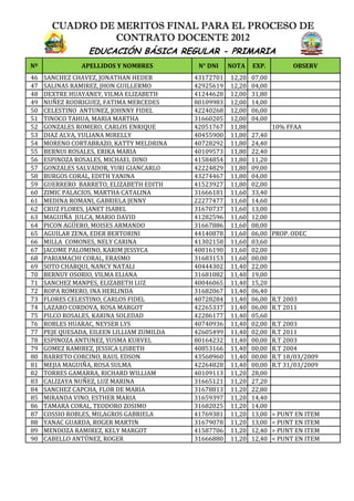 Este documento presenta un cuadro de méritos final para el proceso de contrato docente del año 2012 para la educación básica regular primaria. El cuadro incluye el nombre, número de documento de identidad, nota y experiencia de 135 postulantes.