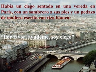El cuento trata sobre un ciego que pedía limosna en París con un cartel que decía "Por favor, ayúdenme, soy ciego". Un publicitario pasó y reescribió el cartel sin permiso. Al día siguiente, el sombrero del ciego estaba lleno de billetes y monedas. Cuando el ciego le preguntó qué había escrito, el publicitario respondió que usó otras palabras que estaban de acuerdo con el mensaje original. El nuevo cartel decía "Hoy es primavera en París, y yo no puedo verla