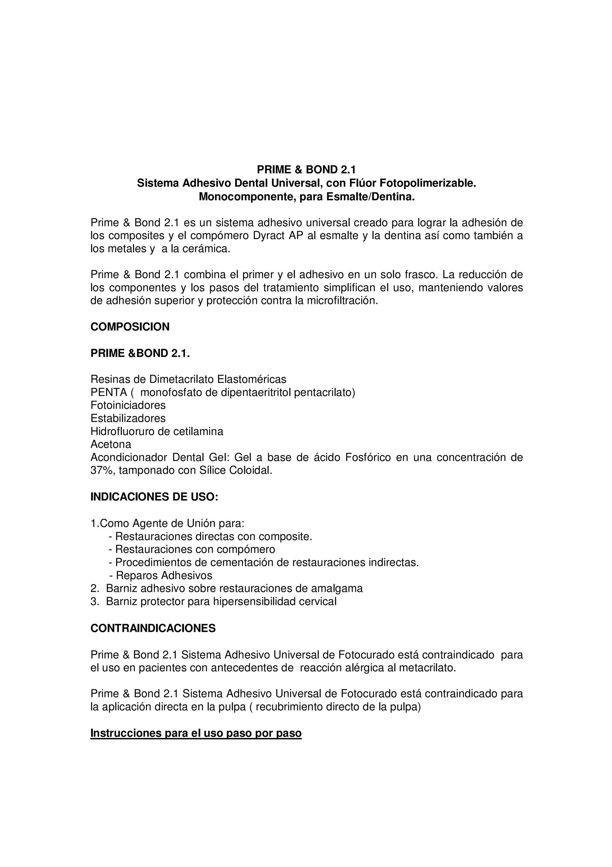 Prime & Bond 2.1 es un sistema adhesivo dental universal monocomponente que combina el primer y adhesivo en un solo frasco para simplificar su uso. Se usa para adherir composites, compómeros, restauraciones indirectas de metal, cerámica y composite a esmalte y dentina. Proporciona alta adhesión y protección contra filtraciones microscópicas. Incluye instrucciones detalladas para su aplicación en diferentes procedimientos dentales.