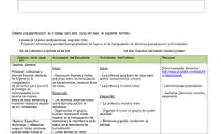 El documento presenta una planificación de cuatro clases para un tercer curso básico sobre buenas prácticas de higiene en la manipulación de alimentos. La planificación incluye objetivos de aprendizaje, actividades del estudiante y del profesor, y recursos. Las clases se enfocan en reconocer buenas y malas prácticas, analizar precauciones para alimentos de origen animal, aplicar medidas de higiene, y comprender formas de conservación de alimentos. El profesor guía actividades como ver videos, leer textos