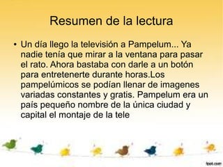 Un día llegó la televisión a Pampelum, una pequeña ciudad capital de un país también llamado Pampelum. Los habitantes de Pampelum ya no tenían que entretenerse mirando por la ventana y podían disfrutar de imágenes constantes y gratuitas con solo apretar un botón. La televisión ofrecía nuevas formas de entretenimiento a los pampelúmicos.
