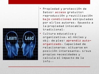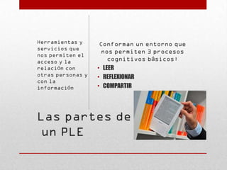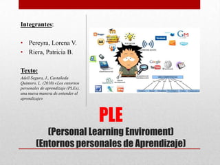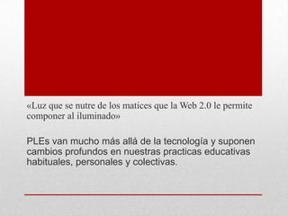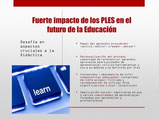 Este documento explora los entornos personales de aprendizaje (PLE), definidos como el conjunto de herramientas, fuentes de información, conexiones y actividades que una persona utiliza para aprender. Explica que un PLE va más allá de la tecnología e implica cambios en las prácticas educativas individuales y colectivas. También describe los tres tipos de elementos que componen un PLE: herramientas de acceso a la información, herramientas de creación y edición de información, y redes de relación con otras personas.