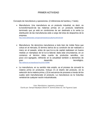 El documento define la manufactura como la transformación de materias primas en productos terminados listos para la venta. Explica que las operaciones son procesos que agregan valor convirtiendo insumos en productos y servicios útiles. Finalmente, describe que los sistemas de manufactura y operaciones clasifican artículos en grupos según sus características y tienen propiedades como ayudar en la planificación, control de calidad y toma de decisiones para impactar el mercado.