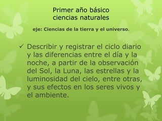 El documento describe el objetivo de ciencias naturales para el primer año básico, el cual es describir y registrar el ciclo diario y las diferencias entre el día y la noche, observando el sol, la luna, las estrellas y cómo afectan a los seres vivos y el ambiente.