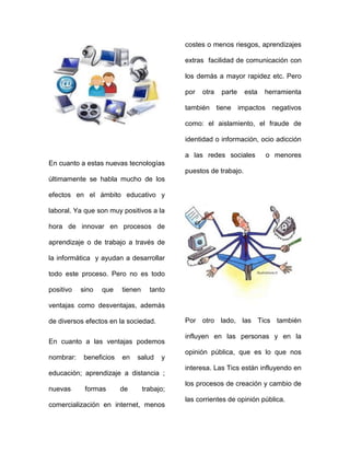 El documento analiza los efectos de las tecnologías de la información y la comunicación (TIC) en la sociedad. Explica que las TIC tienen tanto ventajas como desventajas, influyendo en la educación, el trabajo y la opinión pública. Por un lado, facilitan el aprendizaje y la comunicación, pero también pueden aislar a las personas y manipular su opinión. El documento concluye enfatizando la importancia de usar las TIC de forma responsable para no afectar la integridad social y mental.