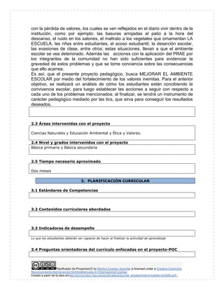 El documento presenta un planificador de proyectos para un proyecto pedagógico llamado "TIT@ ENSEÑA VALORES Y ME EDUCA AMBIENTALMENTE" en la Institución Educativa INEM - Jorge Isaacs. El proyecto busca mejorar el ambiente escolar mediante el fortalecimiento de valores como respuesta a problemas como la pérdida de valores, basuras arrojadas y maltrato a vegetales. El proyecto involucra las áreas de Ciencias Naturales, Educación Ambiental, Ética y Valores en pri