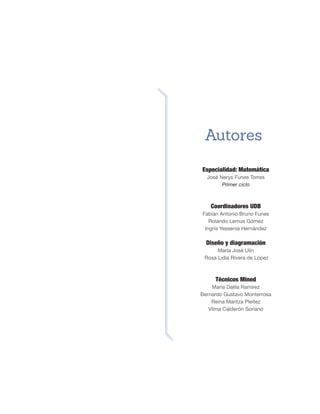 Este documento presenta una guía de recursos para docentes de matemática de primer ciclo con el objetivo de actualizar sus competencias disciplinares y pedagógicas. Incluye unidades sobre operaciones básicas como suma, resta, multiplicación y división, con contenidos, actividades y estrategias metodológicas. La metodología propuesta comprende fases presenciales y no presenciales, con énfasis en el desarrollo del razonamiento matemático y su aplicación a través de la resolución de problemas.